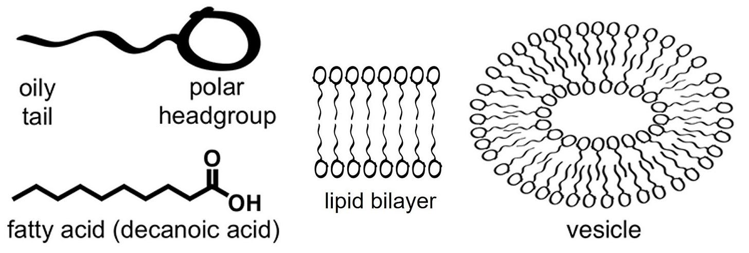 The simplest boundaries turned out to be the easiest to imagine: fatty acid vesicles. Fatty acids, a simple type of lipid, are long hydrocarbon chains with a carboxyl group attached to one end. Carboxyl groups are ‘polar’, i.e., they love water. Hydrocarbon chains, being non-polar or ‘oily’, do not. When you have enough fatty acids in water, they will form a bilayer, like a sandwich, with the water-hating hydrocarbon chains facing inside, away from water. This is a lipid bilayer.
