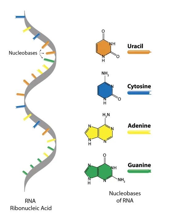 RNA is a long chain, or polymer, made of a backbone of alternating sugar and phosphate molecules. Attached to each sugar is one of four nucleobases, which carry the genetic instructions. The sugar is called ‘ribose’, and the phosphates give the entire molecule its acidic properties, hence the name RiboNucleic Acid. In other words, RNA is too cumbersome a molecule to spontaneously appear fully formed on prebiotic Earth.